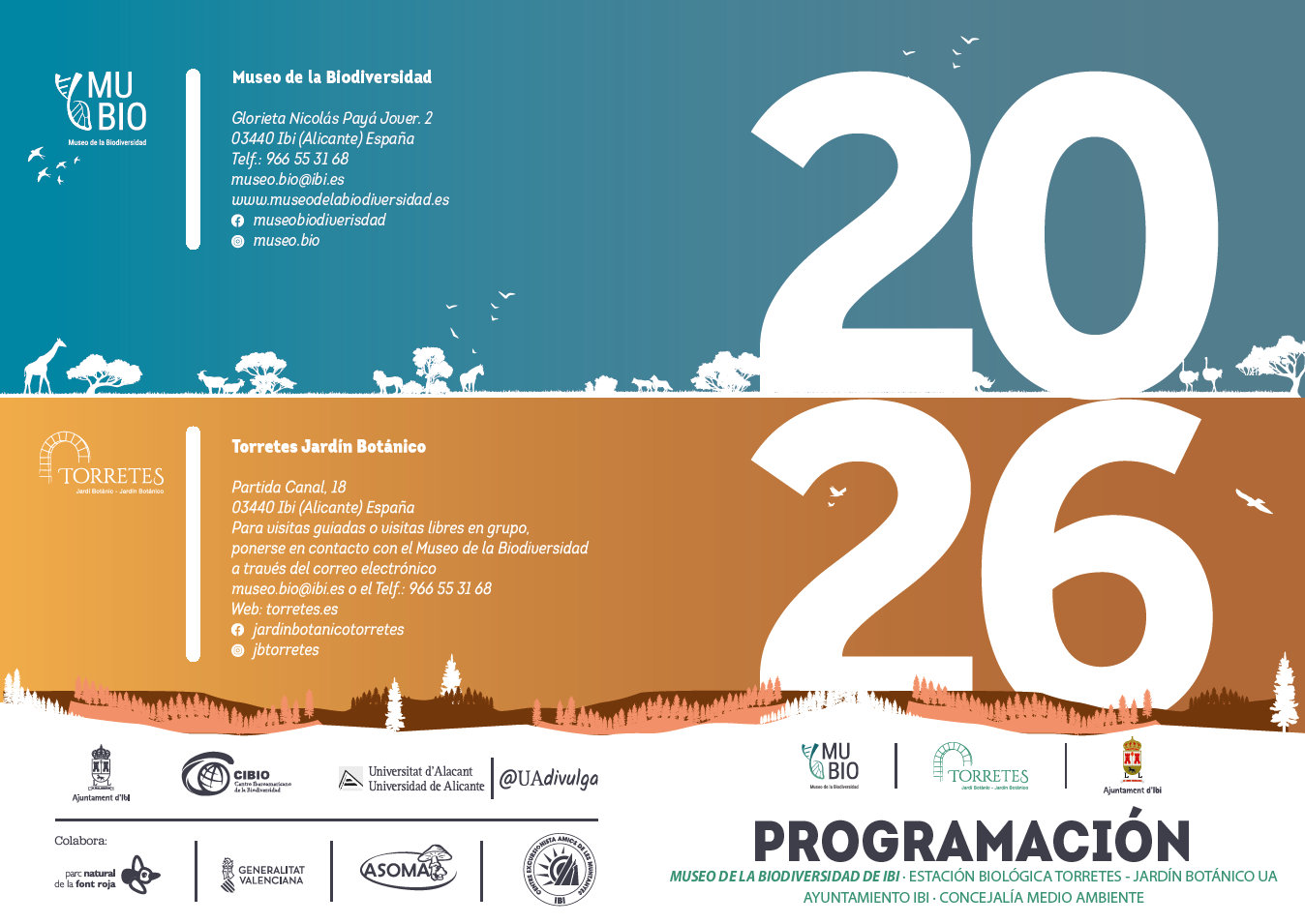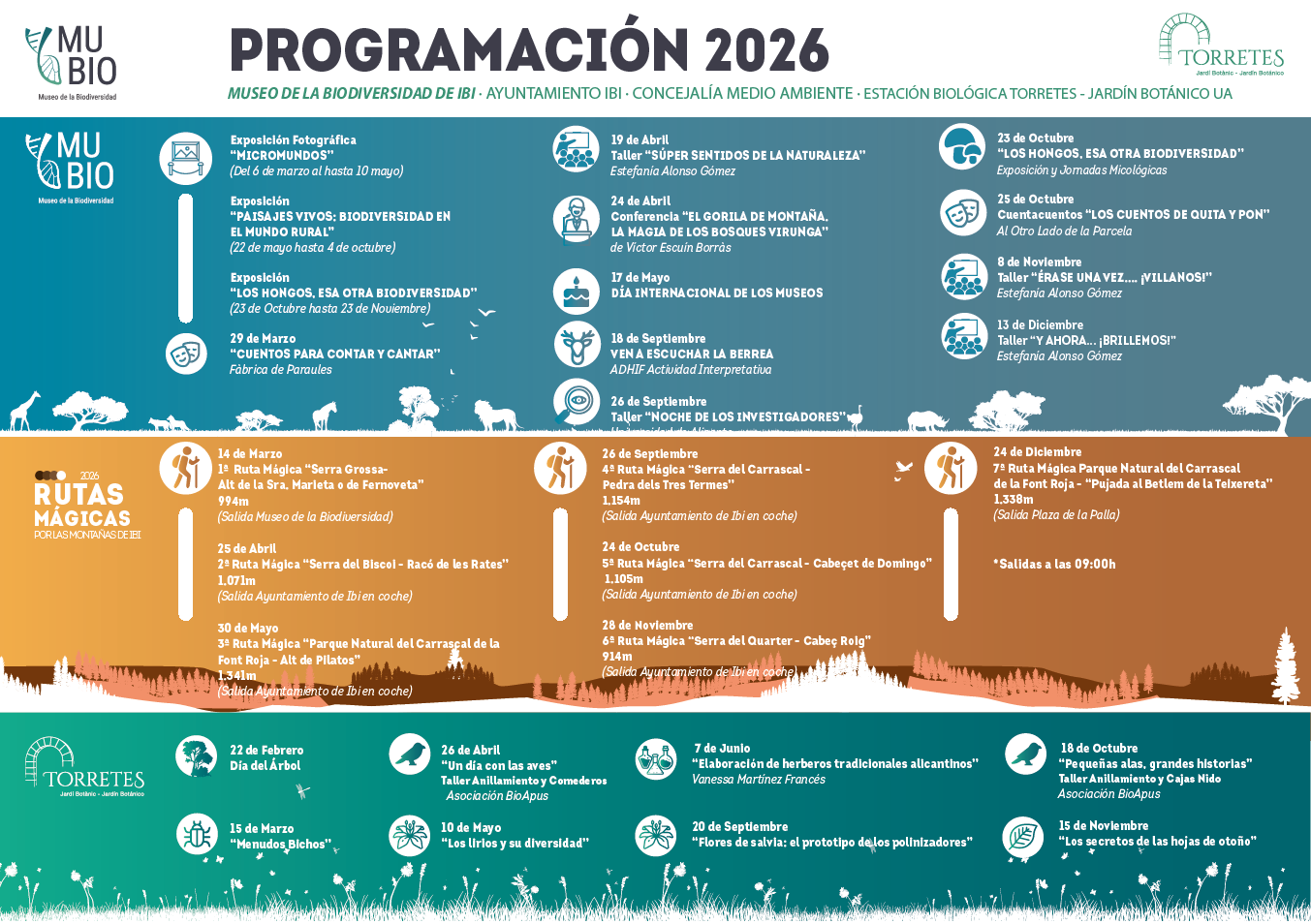 El Museo de la Biodiversidad de Ibi y el Jardín Botánico de la Estación Biológica Torretes han programado las actividades, talleres y exposiciones que se van a celebrar en sus instalaciones durante este año 2026, organizadas en colaboración con el Ayuntamiento de Ibi y la Universidad de Alicante, desde el CIBIO. Además, en algunos de los eventos cuentan con la colaboración de “Amics de les Muntanyes”, el Parque Natural de la Font Roja y la Asociación micológica ASOMA.
