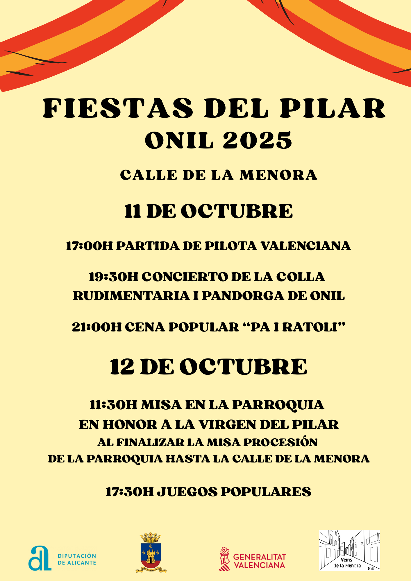 El Ayuntamiento de Onil, a través de la Concejalía de Fiestas y con la colaboración de los vecinos y vecinas de la calle de La Menora, presenta la programación de las Fiestas del Pilar 2025, que se celebrarán los días 11 y 12 de octubre.