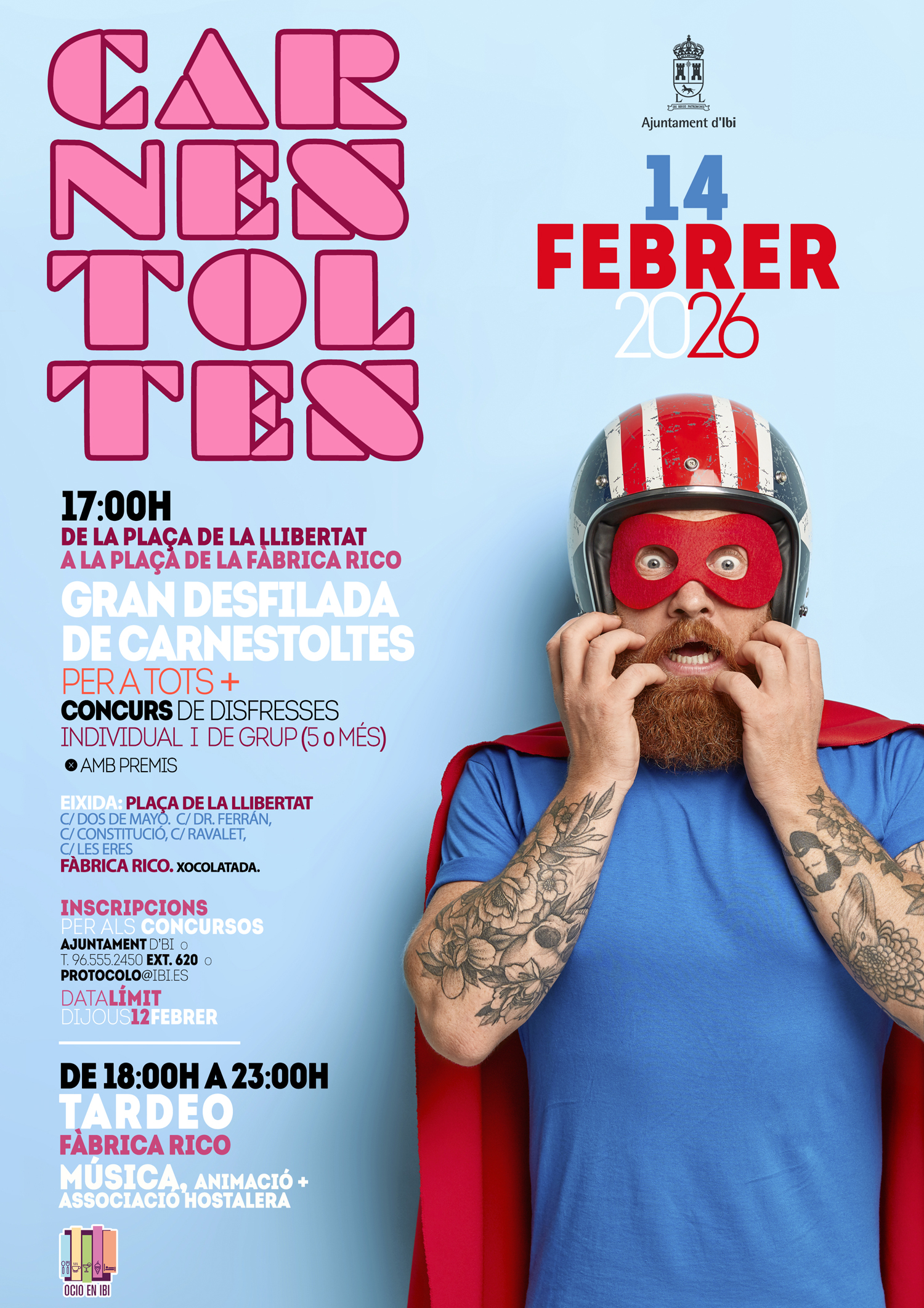 La concejalía de Fiestas y Tradiciones del Ayuntamiento de Ibi organiza una gran fiesta de Carnaval para el próximo 14 de febrero, con la celebración de un gran desfile de Carnaval para todos los públicos, la organización del concurso de disfraces y el tardeo con música y animación.