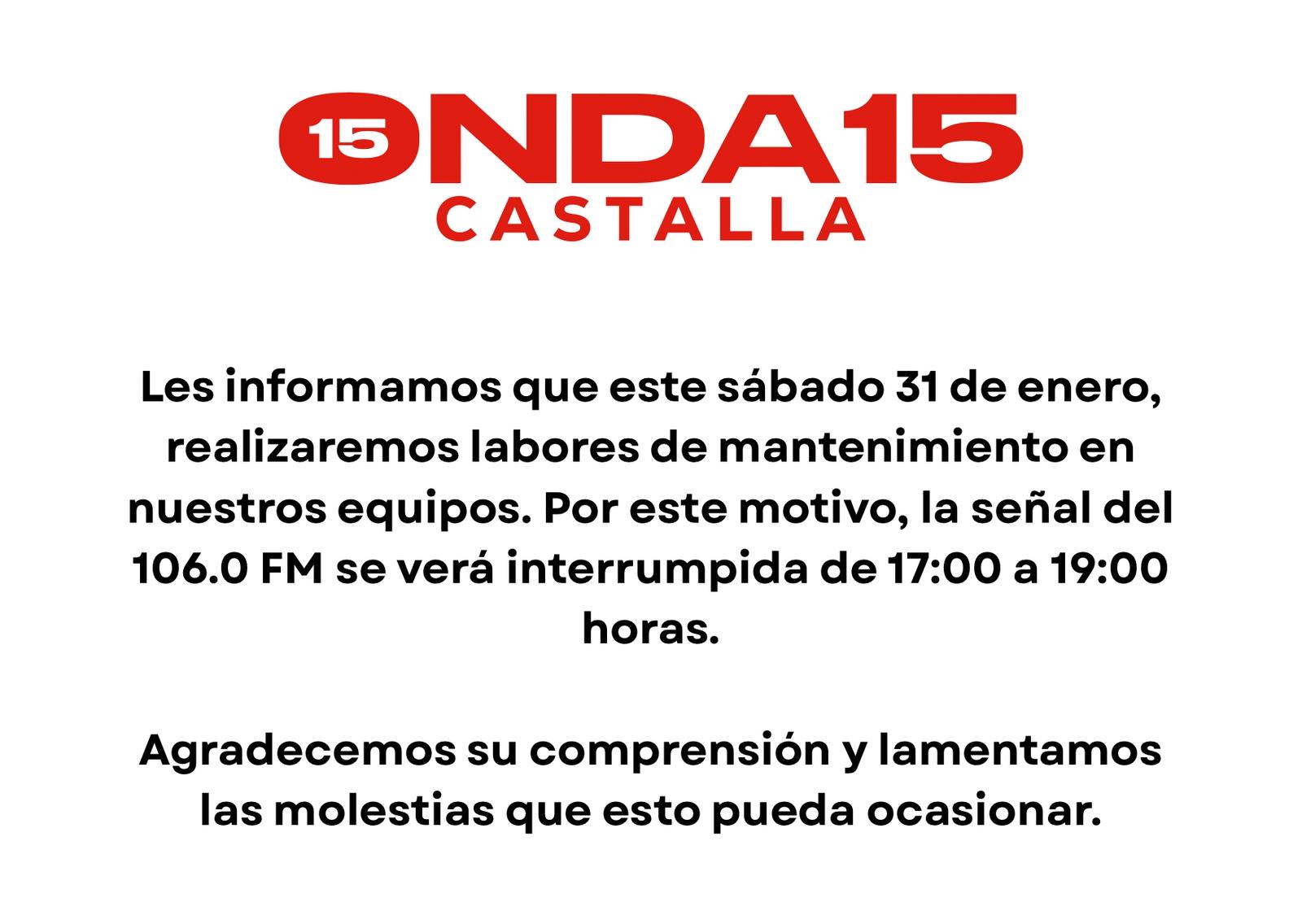 Mantenimiento de equipos de Onda 15 Castalla para este sábado 31 de Enero
