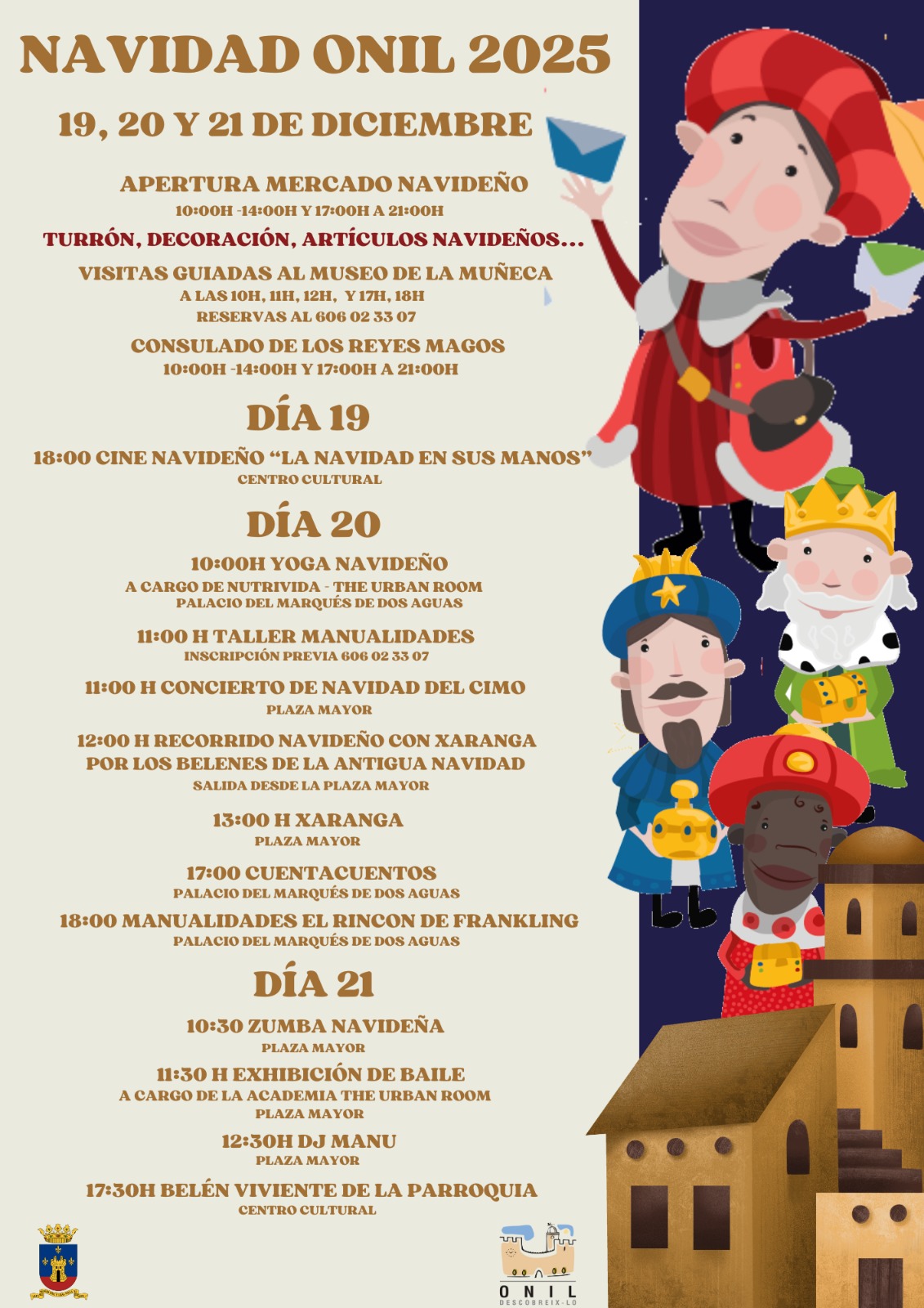Durante estos días, Onil se convertirá en un punto de encuentro navideño con propuestas culturales, familiares y de ocio repartidas por distintos espacios del municipio. Entre las actividades destacadas se encuentra la apertura del Mercado Navideño, el Consulado de los Reyes Magos, las visitas guiadas al Museo de la Muñeca, cine navideño, conciertos, talleres infantiles, cuentacuentos, actividades deportivas, música en directo y exhibiciones de baile.