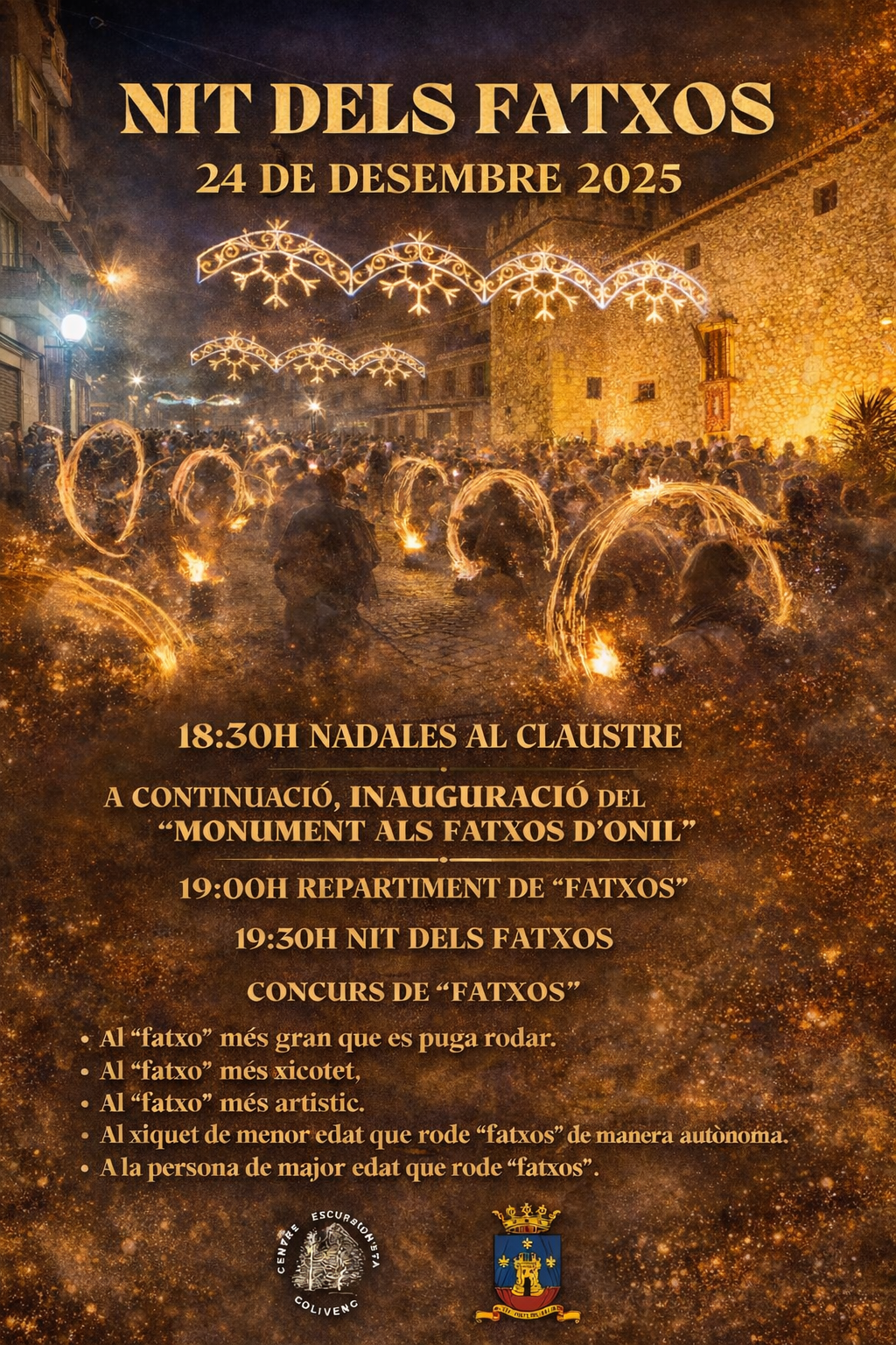 La Nit dels Fatxos 2025 cuenta, un año más, con la colaboración del Centre Excursionista Colivenc, entidad fundamental en la conservación y difusión de esta tradición. Año tras año, el Centre Excursionista Colivenc organiza talleres de realización de fatxos, transmitiendo los conocimientos necesarios para su elaboración y fomentando la participación intergeneracional.