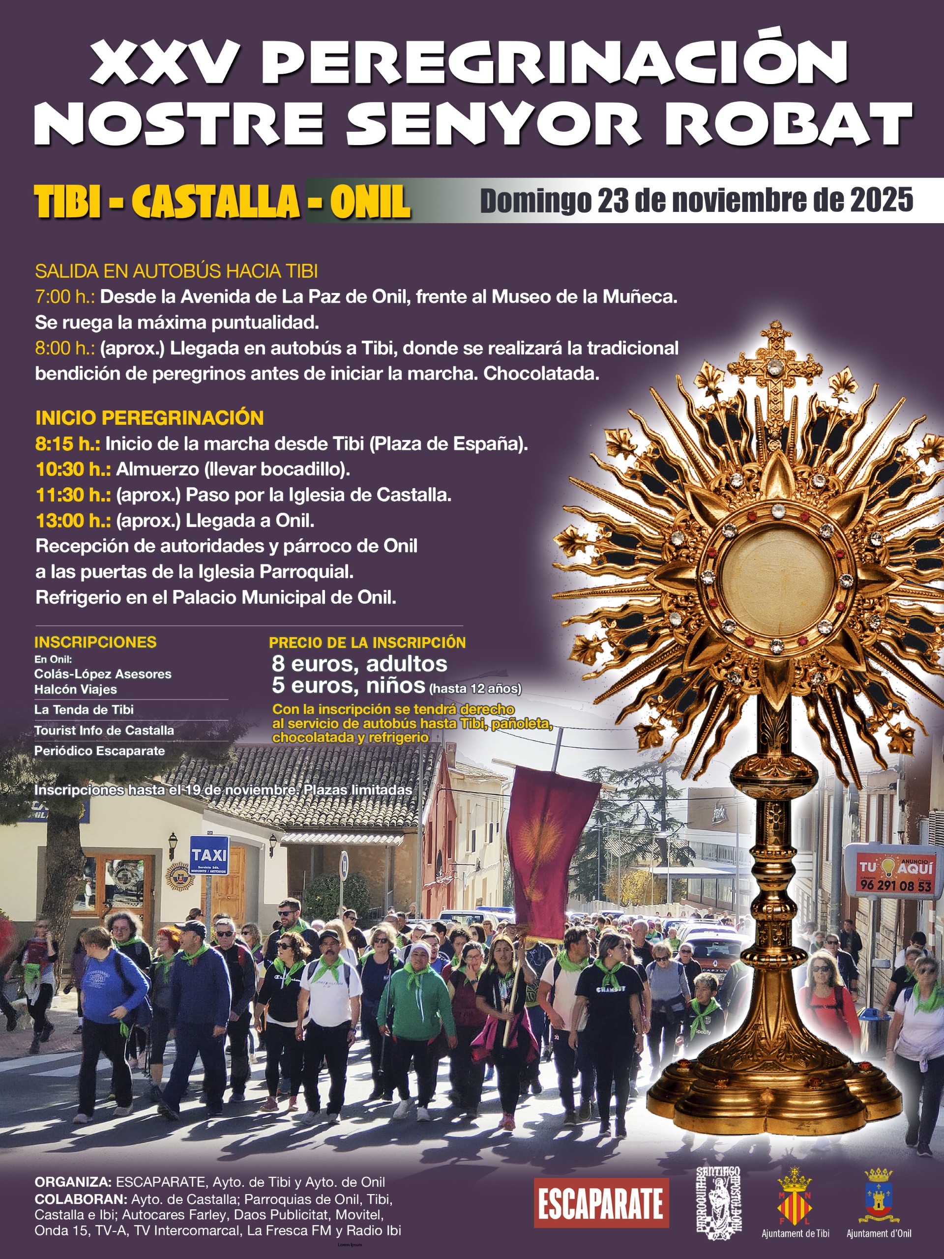 El próximo domingo 23 de noviembre de 2025 tendrá lugar la XXV Peregrinación a Nostre Senyor Robat, una cita ya tradicional que une a las localidades de Tibi, Castalla y Onil en una jornada de fe, convivencia y tradición compartida.